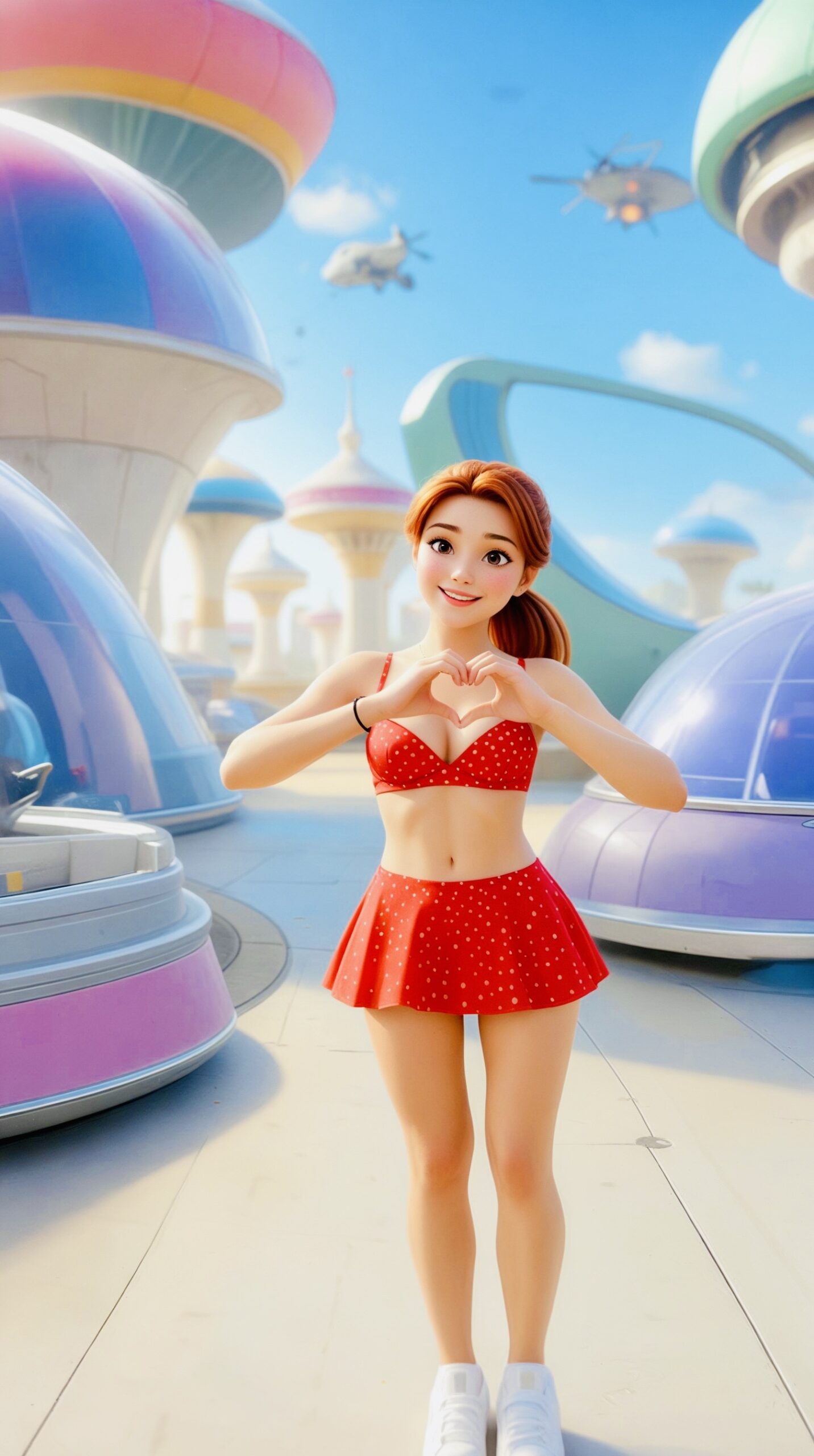 We were walking through the upper tier of the city, where the architecture looks like giant scoops of futuristic ice cream. Sky-cruisers were humming overhead, leaving soft white trails in the air. Abi stopped dead in her tracks, framed perfectly against a cluster of pink and yellow towers.
