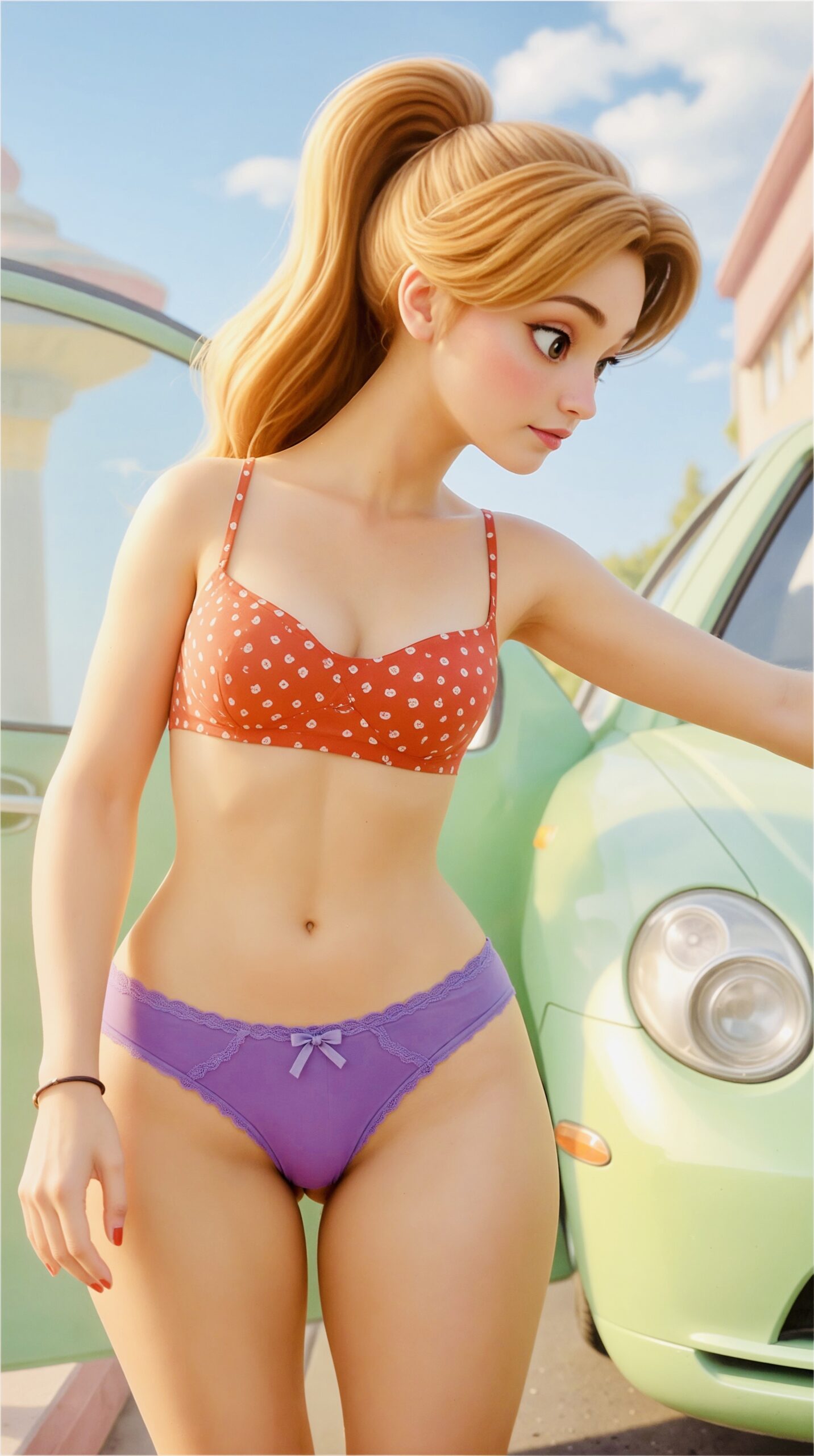She approached it like it was a sleeping dragon. She ran her hand along the passenger door, the metal cool under her touch. The contrast was striking—Abi, in her bright, playful outfit, standing next to this silent, green ghost of the past, while the futuristic city loomed in the distance behind us. She leaned against it, lost in thought, the slight pressure causing the fabric of her shorts to pull taut across her backside. I zoomed in slightly, ensuring the composition was perfect.